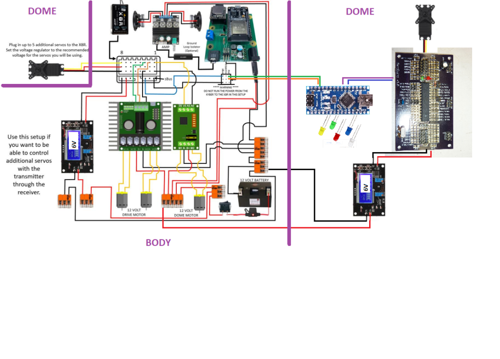 De momento no se seguro que hare (bueno, si no consigo que funcione el maestro pues usare esto seguro), pero por si acaso he creado ya un pequeño esquema de conexiones con el sistema arduino. Así sería la electrónica completa de mi droide.