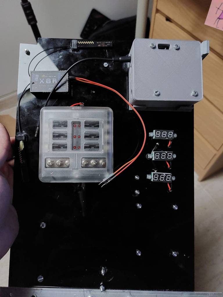 Por otro lado he seguido instalando la electrónica en la placa de metacrilato. El droide irá a 24V de base para la parte de los motores de las patas, pero luego el resto de la electrónica principal irá a 12V. Por ello he instalado un buen transformador de 24 a 12V. Además he fijado la Sabertooth y el transformador a 5V que se usa para alimentar el Pololu maestro que moverá los servos del cuerpo y la placa de las luces del Data Panel y el Charge port. También he fijado ya la placa del slipring.