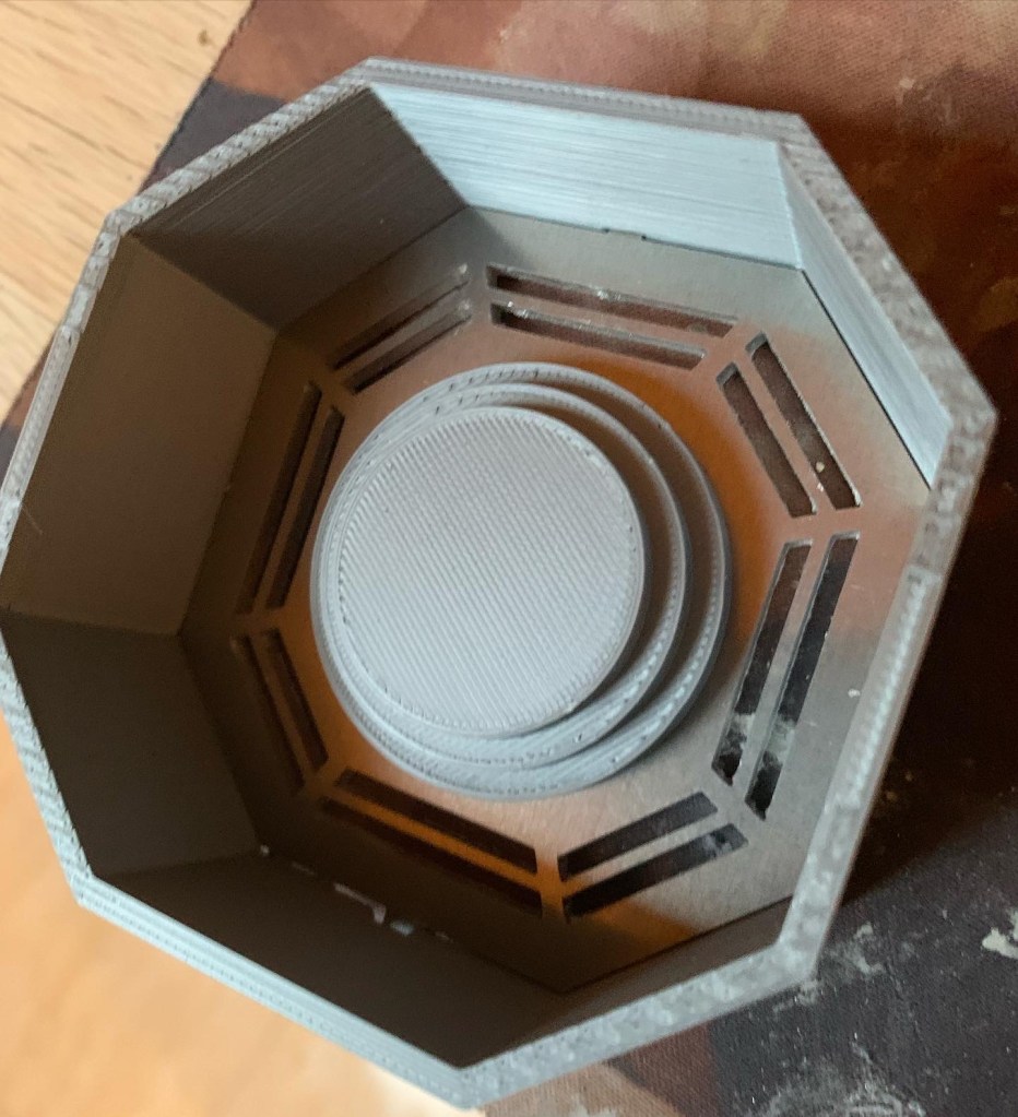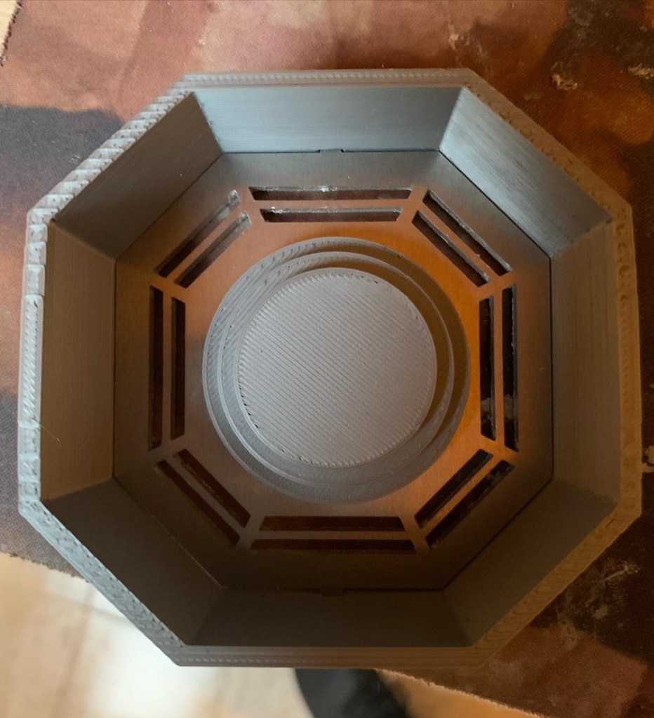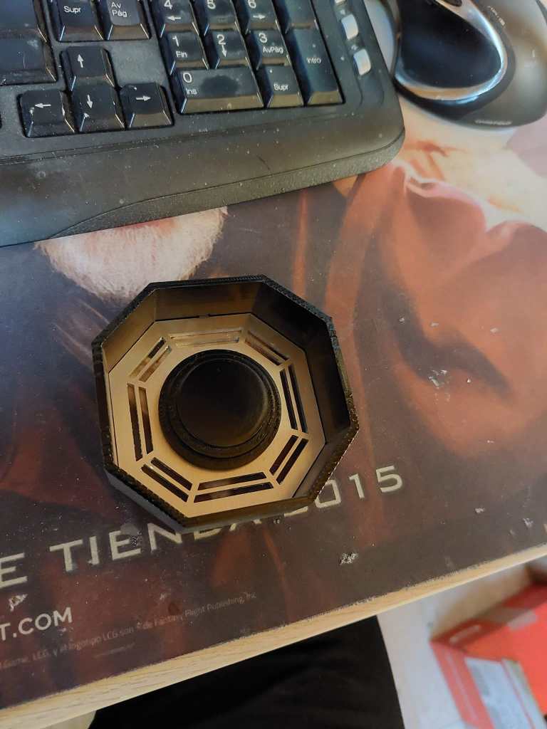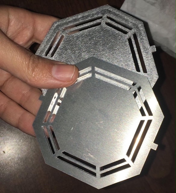 También he avanzado con algunas de las piezas del cuerpo. Ya he recibido los coin returns y me he puesto con los octogonal ports. Para estos últimos, en lugar de comprarlos enteros (son bastante caros, unos 300€ mas envío y aduanas) he decidido hacer un mix entre aluminio e impresión 3D. Todo el marco de la pieza (Que apenas se ve) y el circulo central (que se puede trabajar muy fácilmente par dejarlo liso) irá impreso. El fondo de la pieza, que va sin pintar irá en aluminio. He sacado los planos de los ficheros de Baddeley y contacté con una empresa de corte láser, que por unos 50€ puesto en casa me hizo esas piezas. Os dejo unas fotos para que lo veáis más claro: