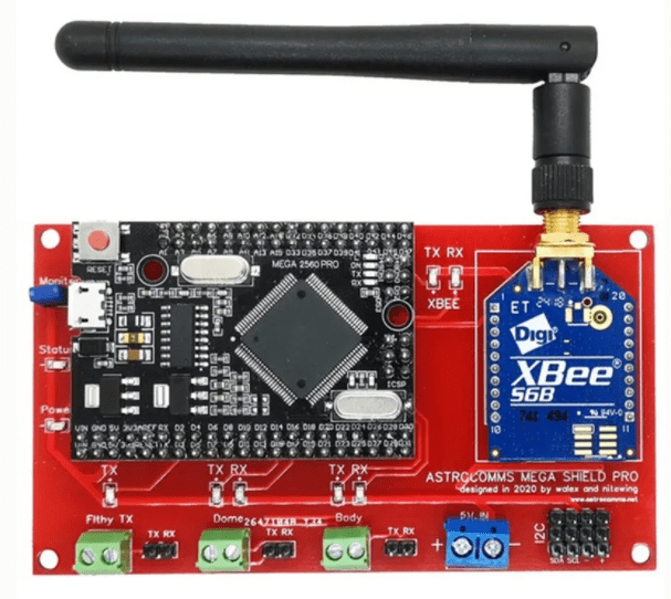 Esta placa lleva integrado el puerto para conectar el XBEE (wifi), más una placa Mega 2560 donde corre el código Astrocomms. Esta placa normalmente se instalará en el Dome, aunque se puede instalar en el cuerpo si se está usando marcduino también para los paneles del cuerpo. La conexión es la siguiente: