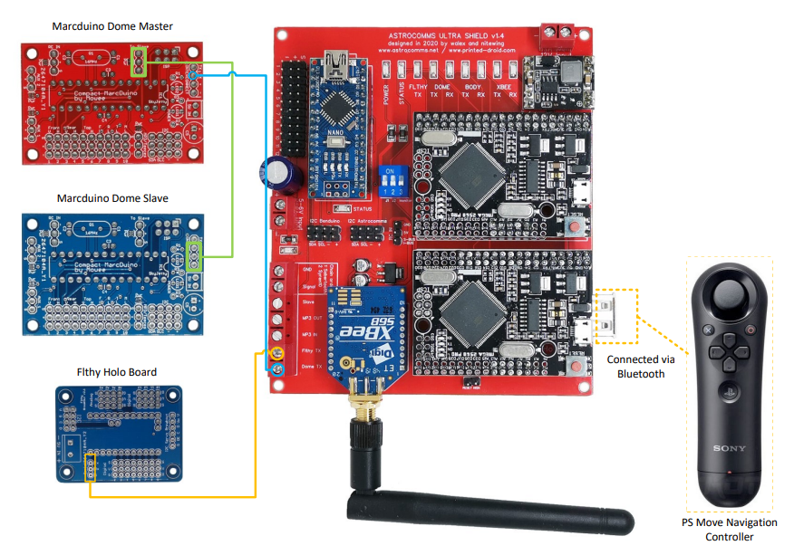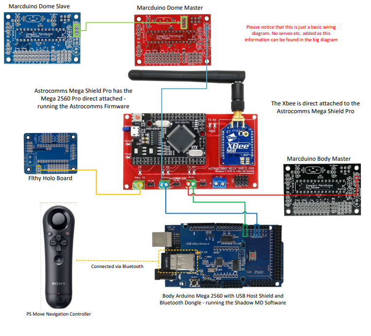 Esta placa hace lo mismo que la Mega shield pro, pero tiene también la placa Mega 2560 adicional donde corre el sistema Shadow. Es decir, con esta placa no necesitas la Arduino mega ADK que normalmente lleva el sistema Shadow. Además lleva otra arduino nano donde corre el sistema Benduino (es igual que el marcduino pero corriendo en una arduino normal) para el control de los paneles del cuerpo. Como se puede intuir, esta placa se debe instalar en el cuerpo del droide. Tiene salidas para los motores del dome y patas, así como para conectar las marcduino del dome y el MP3 Trigger. La conexión es la siguiente: