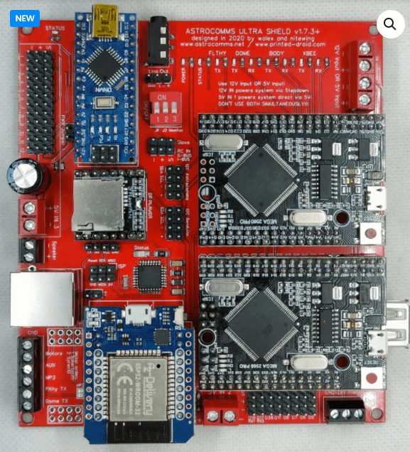 La tercera placa es la Astrocomms Ultra Plus y es dar una vuelta de tuerca más a la placa anterior incluyendo dentro el MP3 Trigger (realmente lleva un DFPlayer). Es decir, en una sola placa tendremos: Placa corriendo Shadow, Placa para controlar paneles del cuerpo, Conector Bluetooth, conexión wifi y sistema de audio.