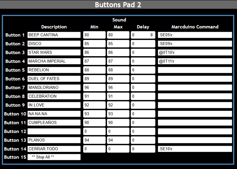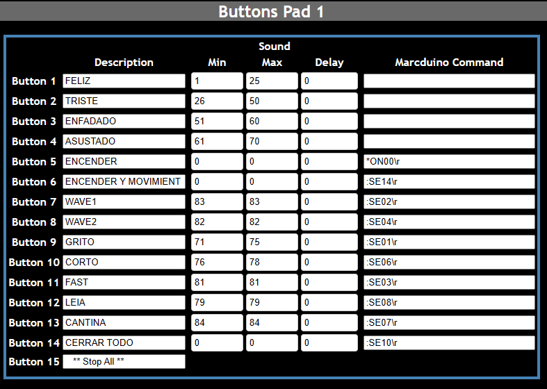 Ahora nos aparece una nueva opción para marcar de «usar marcduino» y se habilita un cuadro de texto por botón para que pongamos la orden en lenguaje marcduino. Por ejemplo, para mis botones he configurado esto: