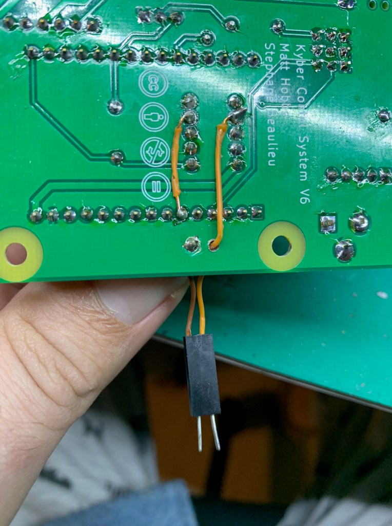 Por desgracia, la placa Kyber no venía preparada para sacar ordenes en el puerto serie, por lo que hay que hacer una pequeña modificación en la placa. Básicamente es soldar 2 cables en unos sitios específicos y sacar de ahí los conectores Tx y GND que conectaremos al Rx y GND de Marcduino.