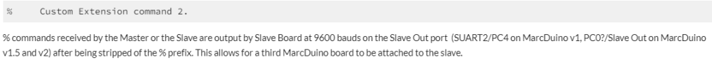 Traduciendo: Los comandos que empiezan por % son pasados desde la placa esclavo por su puerto de salida, quitando el prefijo %. Es decir, que si yo mando a marcduino el comando %LUZ\r , se expulsará LUZ\r por ese puerto serie.