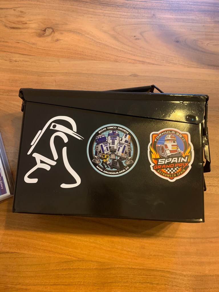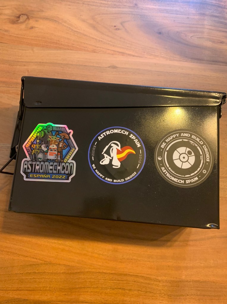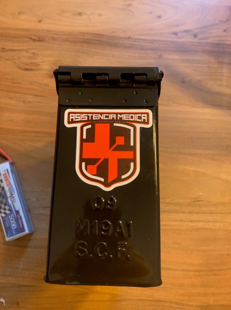 Para transportar las baterías en los eventos y almacenarlas mientras no se están usando, es interesante tener algún tipo de caja ignífuga por seguridad. En mi caso uso cajas de munición. Son fácilmente conseguibles en rastrillos e internet. La he pintado (estaba muy vieja) y decorado con algunas pegatinas. Os dejo algunas fotos: