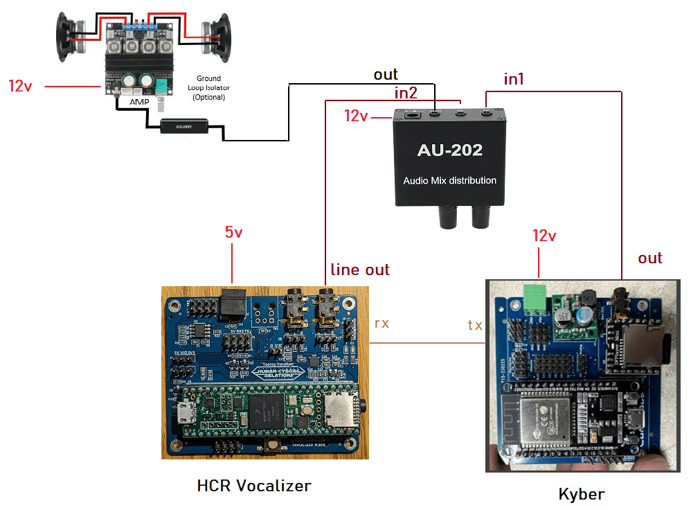 Quiero poder reproducir sonidos tanto desde el Kyber, como desde el HCR, por lo que necesitaré un mezclador de sonido con 2 entradas y una salida. Es cierto que podría reproducir todo desde el HCR metiendo las canciones en la propia su tarjeta SD, pero me gusta poder controlar el volumen de esas canciones desde el Kyber y que haya sonido de arranque que hace el propio Kyber, dejando solo en el HCR los sonidos que genera automáticamente, que ya es mucho.